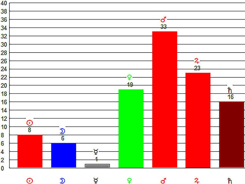 Nadat we de meest dominante planeet van het trio Mercurius, Venus en Mars gevonden hebben, onderzoeken we eerst even of er voldoende ambitie in de horoscoop aanwezig is. Wel, de geniture in deze horoscoop volgens PlanetDance is, niet verbazingwekkend, Mars. Deze is hiermee ook meteen de magistry-planeet. Mars schenkt naast sport in negatieve zin, de behoefte om als een uit de heup schietende woesteling door het leven te gaan, ook technisch inzicht. Technisch inzicht hóórt bij Mars. Mars gaat daarnaast over grote bouwprojecten en wetenschap. A la Mars durft men bovendien af te wijken van de gangbare paden en risico’s te nemen. Hiermee schenkt Mars een uitvindersgeest en het vermogen om te improviseren.