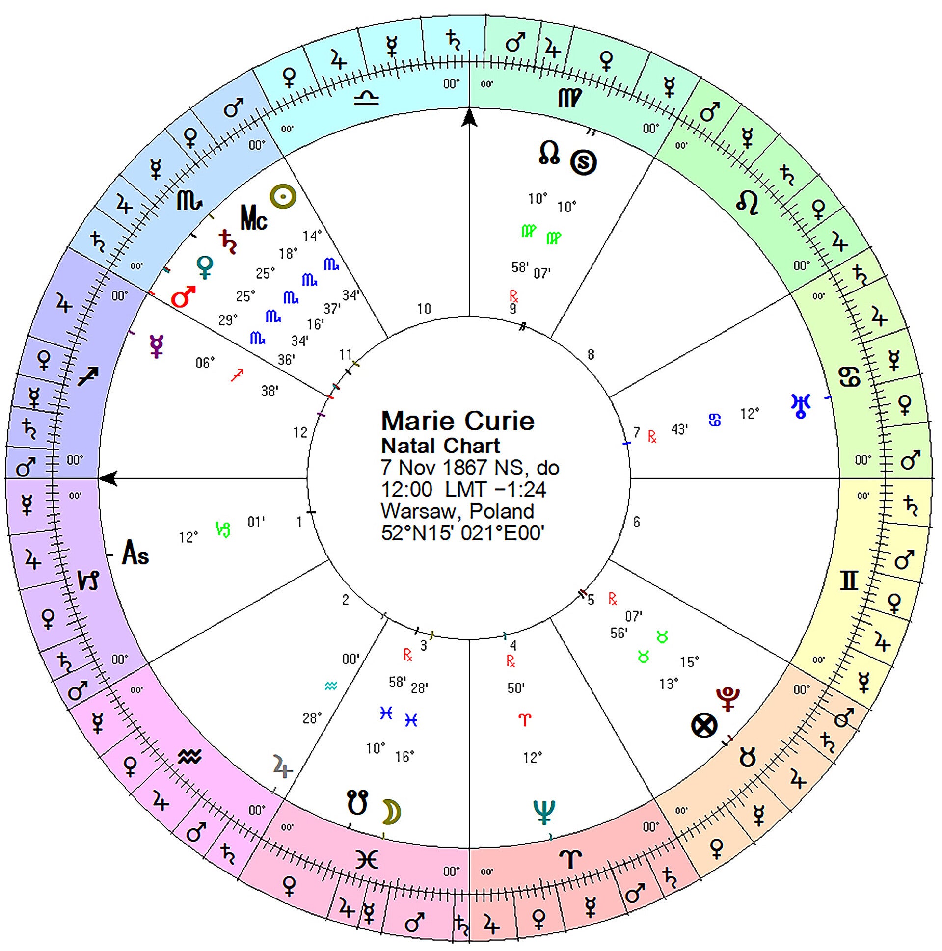 We kunnen met de gevonden aanwijzingen natuurlijk nooit met honderd procent zekerheid beweren dat de horoscoopdraagster een wetenschapper is. We zien echter wel met Mars als haar magistry planeet, een nadruk op zwaar werk (ze werkte in eerste instantie onder erbarmelijke omstandigheden) en onderzoekswerk (Mars in Schorpioen). We weten ook Marie Curie zich niet liet imponeren door het elitaire mannenbolwerk waartoe de wetenschap destijds behoorde en ging haar eigen weg (Mars). Wat we mogen concluderen, is dat de horoscoopdraagster een vasthoudende (vaste kruis) onderzoekster is, een vorser met een technische inslag (Mars), die niet rust voordat ze haar doel heeft bereikt, en die onder meer gemotiveerd wordt door een sterke sociale betrokkenheid (elfde huis).